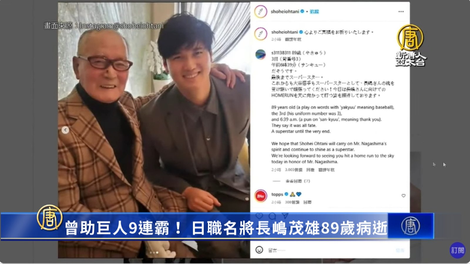 日本職棒讀賣巨人隊的終身名譽監督長嶋茂雄,今天清晨因肺炎病逝,享壽89歲。長嶋曾是巨人隊球星,被暱稱為「職棒先生」,他與王貞治組合的「ON」砲,打造巨人隊九連霸的黃金時代。 //www.ntdtv.com.tw/public/uploads/assets/2025/06/03/2025-06-03-683e828ec8466-220x123-169.jpg 長嶋茂雄|病逝|日本職棒2025-06-03 13:11:33