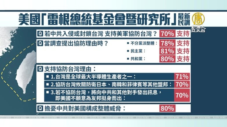 美國「雷根總統基金會暨研究所」22日公布最新民調,顯示美國民眾高度支持美國出兵協防台灣:如果中共入侵或封鎖台灣,七十%的受訪者支持美軍協防台灣,當調查提出協防理由時,不分黨派整體支持度更增加至七十八%。 //www.ntdtv.com.tw/public/uploads/assets/2025/06/25/2025-06-25-685b8091c17f4-220x123-169.jpg 雷根研究所|台海戰爭|民調2025-06-25 13:21:11