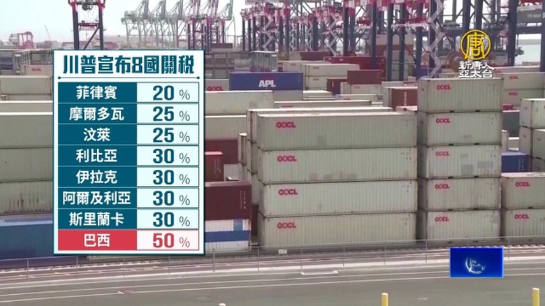 新聞開始來看到,美國總統川普在美東時間9日,陸續再公布8國關稅稅率,其中沒有台灣,而巴西,被課徵高達50%的稅率,也是目前為止最高的稅率,消息讓巴西貨幣重貶,川普也下令調查巴西的不公平貿易行為。 //www.ntdtv.com.tw/public/uploads/assets/2025/07/10/2025-07-10-686faa208aa60-220x123-169.jpg 對等關稅|巴西|川普|關稅|魯拉2025-07-10 20:24:25