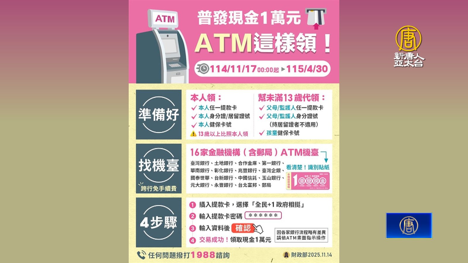 台灣政府,普發現金一萬新台幣,經過了上一波登記入帳,破千萬人次領取後,今天(17日)ATM自動櫃員機也開放領取,動動手指簡單步驟,還有機會獲得銀行、及各大消費通路的加碼優惠。 //www.ntdtv.com.tw/public/uploads/assets/2025/11/17/2025-11-17-691b0ccfcd3b7-220x123-169.jpg 台灣|普發現金|一萬|銀行|ATM|自動櫃員機2025-11-17 20:16:05