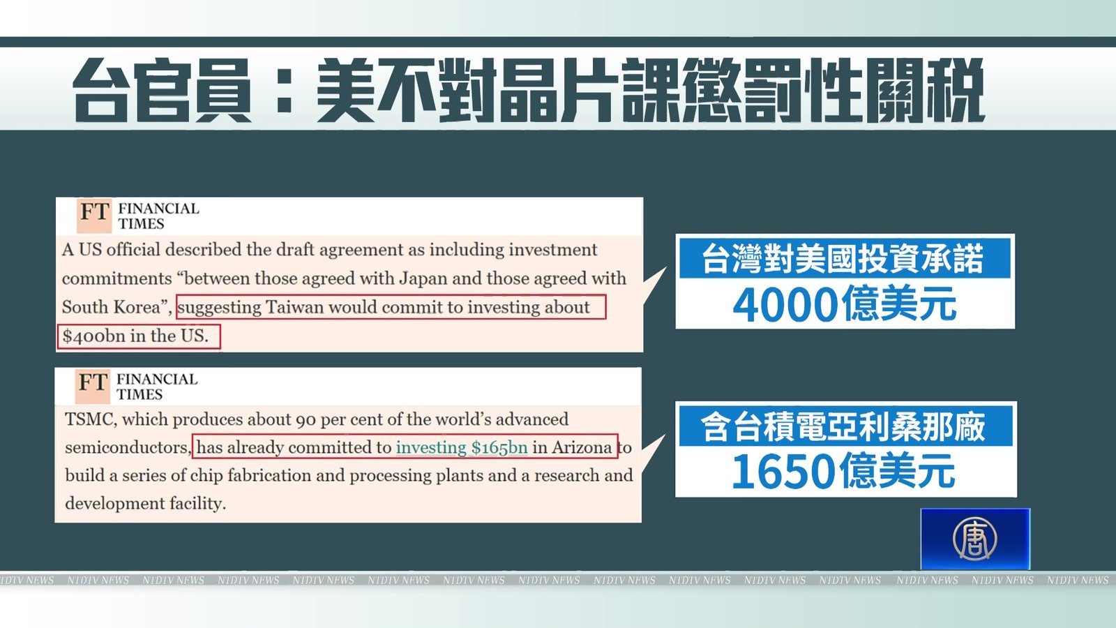 台灣國科會主委吳誠文,接受英國金融時報採訪時透露,美國不會對台灣半導體課徵懲罰性關稅。報導中,美國官員披露,台灣對美投資承諾,上看4千億美元,其中包含台積電投資的1650億美元。對於這一消息,今天(21日)台灣經濟部長,龔明鑫受訪回應,還沒確定。 //www.ntdtv.com.tw/public/uploads/assets/2025/11/21/2025-11-21-692057f6ee457-220x123-169.jpg 台灣|美國|關稅|投資|4000億|台積電2025-11-21 20:34:57