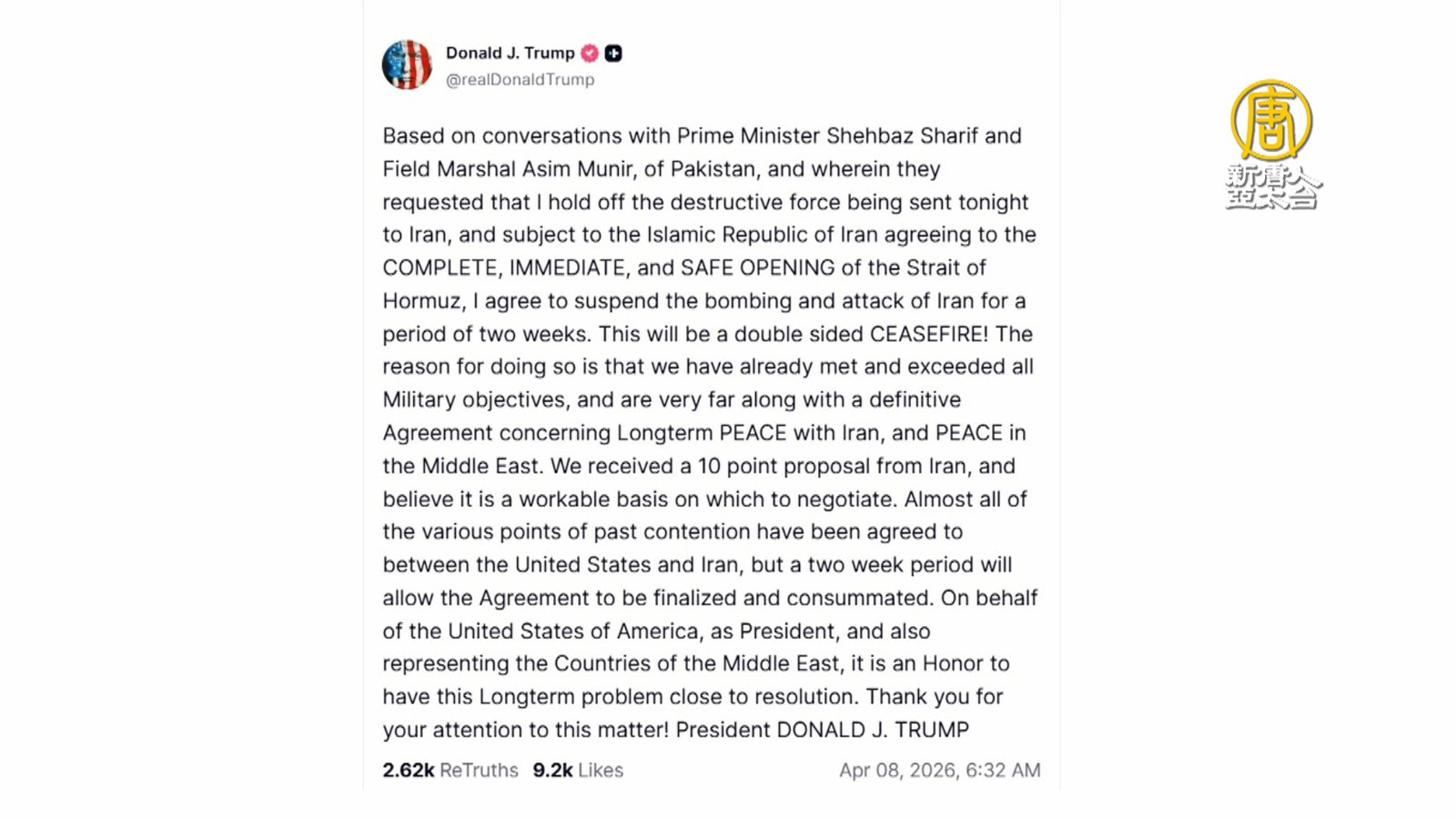 美國、伊朗、與巴基斯坦三方證實,美伊雙方將停火兩週,伊朗外長說,這兩週期間,船隻將可以安全通過霍爾木茲海峽。雙方這個週末將進行談判,但伊朗官媒謊稱,川普已經接受了伊朗提出的10點協議,遭到川普嚴正駁斥,我們連線台灣國防安全研究院國防戰略與資源研究所所長蘇紫雲,為我們分析說明。 //www.ntdtv.com.tw/public/uploads/assets/2026/04/08/2026-04-08-69d643612d53f-220x123-169.jpg 伊朗|停火2026-04-08 20:24:36