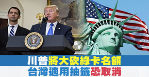 2017-08-03 12:37:07再來看到,美國川普政府,周三公布了《改革美國移民與提振就業法案》,為提高美國公民的就業率。未來,將取消台灣也適用的綠卡抽籤制,而移民審查,也將以會講英語者優先。